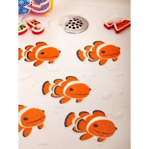 To brighten things up for Astrid, I got her a set of these bright Tub Tattoos which you can affix to the near side of the tub so all your guests won’t see them (unless they opt for a quick bath between dinner and dessert!) A. loves the bright colors and I like to think the fishes keep her company down at her level. They come in all kinds of patterns. Oh – and I only put up two, so her school can grow over time. Might help explain the birds and the bees if you decide to have another baby!