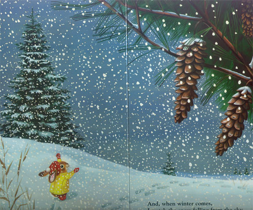 There’s no compelling plot: it’s just a bunny named Nicholas and the simple things he does during the different seasons, like play in the fall leaves or smell the spring daffodils. Adorable and straightforward and attention-grabbing. And she can chew on the edges. Done.
