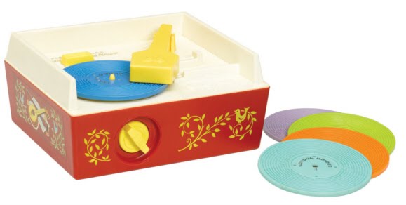 I didn’t have a lot of mainstream toys when I was a kid. My parents were more “use your imagination/we walked uphill barefoot both ways” types, so Lincoln Logs and plain Legos were about it. One exception was the Fisher Price Record Player Music Box, which I LOVED. Not only was I a big fan of music boxes, but this one had ten different songs (five 2-sided “records”) and a carrying slot for those records plus a handle on top, which meant that as a tiny Type A, I could take the whole shedbang with me.