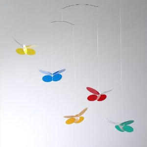 The primary-colored, Calder-ish mobile from CB2 that we hung above our changing area was an early and continuing hit. First, the movement won her over. Then she noticed the colors. Then she pushed herself up and tried to eat it, which has left it a little off kilter, understandably. CB2 discontinued ours, but if you like the abstract design lane, Flensted makes some excellent similar ones as well as a huge selection of mobiles more firmly in the kid lane. Flensteds are very light, so they move in the slightest breeze and a lot of their numerous designs will still be interesting for your child when s/he’s a little older. I really like them, especially the translucent butterflies, which are lovely hung in a window.