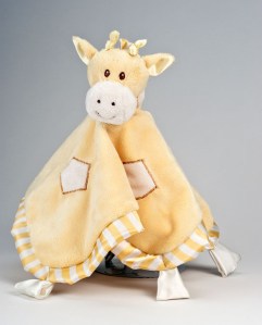 Since it’s no longer considered safe to put blankets or stuffed animals in the crib with your little one, the market for the kind of blankies and teddies you and I grew up with has narrowed to what are usually called “lovies/loveys,” “snugglers,” or sometimes still “blankies.” They’re small blanket squares, usually with a plush bit and a silky bit (’cause babies love textures), and – I don’t know how else to put this – a decapitated stuffed animal head attached. They look weird but seem to serve the purpose.