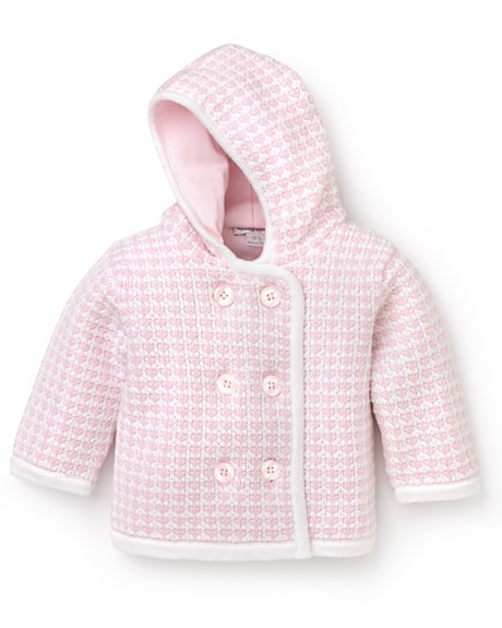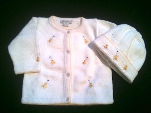 It’s hard to find a strong selection of all their designs and sizes in any one place: I haven’t been able to locate one site or store that stocks both the basics (playsuits, pajamas) and the more dressy cardigans and jackets except at Granny Made’s physical store, but Diapers.com has a surprisingly wide selection of the former. (Kissy Kissy’s own web site doesn’t sell their clothes and is annoyingly unhelpful.) Some baby boutiques carry a selection as do Nieman Marcus and Nordstrom, although they veer towards the more saccharine designs – like cupcakes and hearts – which are not my bag. Bloomingdales’ choices are more classic. In San Francisco, Day One carries a collection of their slightly less pricey, more practical pieces. And in New York, Granny Made carries my favorites, the little cardigan sweaters.