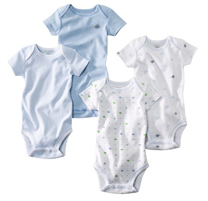 Carter’s 4-pack short-sleeved bodysuits with little tiny elephants, stripes, etc. in brown, pink, or blue, $9 at Target